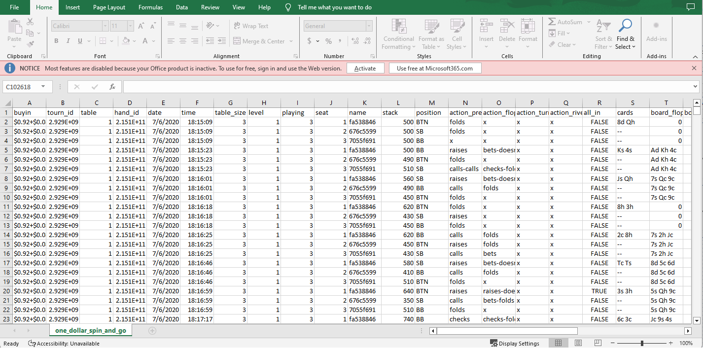 The visualization is also aided with the use of a few colors and shapes to help with insights into the player's decisions (eg. bet/raise/fold) in different hands and different board states (eg. flop/turn/river). This demonstration showcases how seemingly abstract data with >100k rows in tabular format can be quickly converted to simple visuals that can facilitate better understanding of the underlying source.