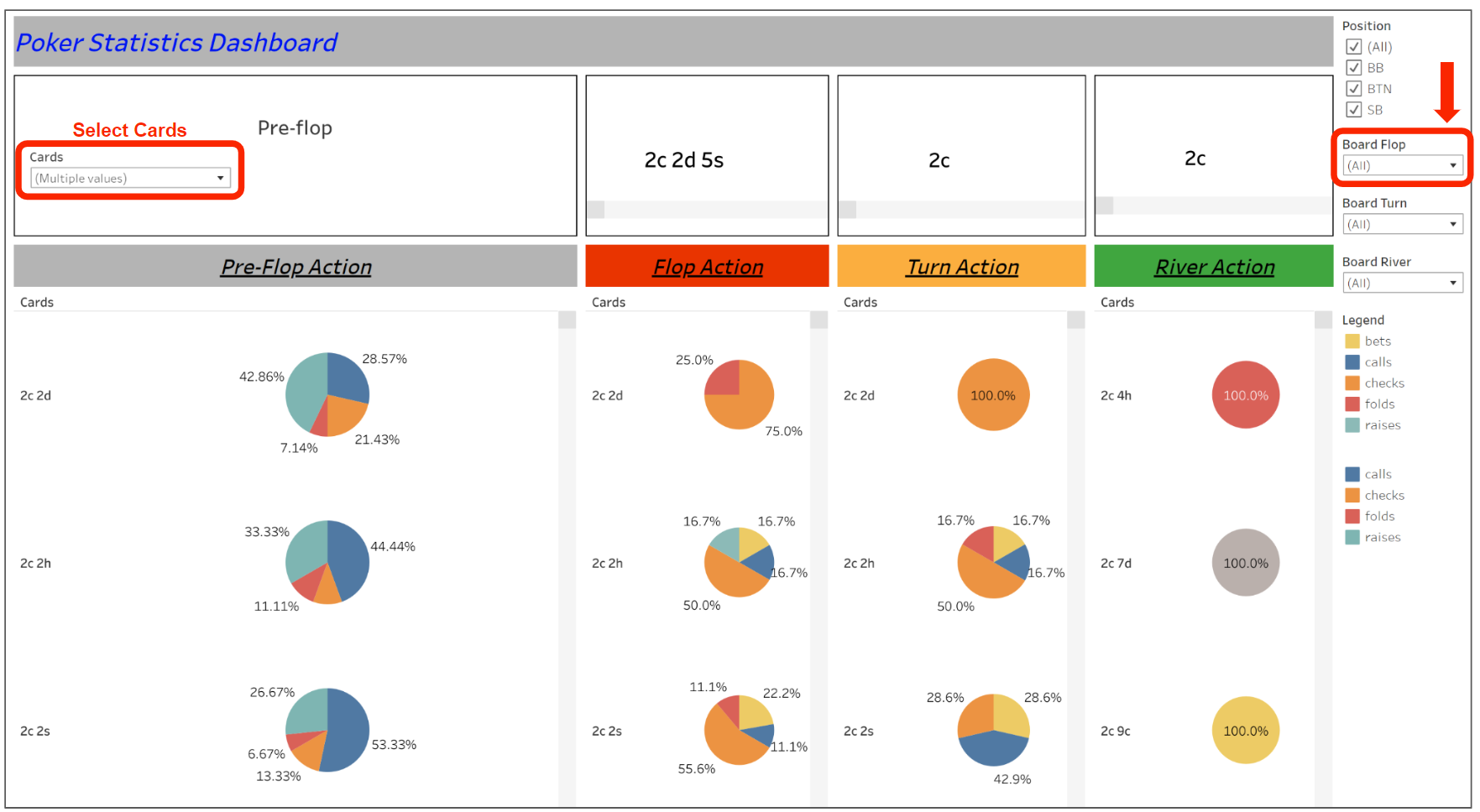 The above illustrates how organization and structure can be use to logically display the flow of the game from left to right, pre-flop to flop, turn and then river. With the use of select filters from the right pane, the dashboard is also able to allow some deepdive anaylsis into particular situations.