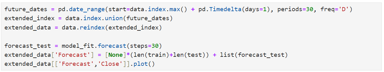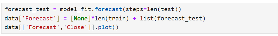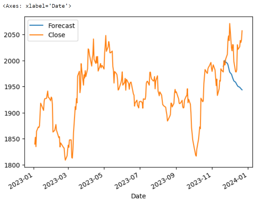 Next is to fit the model using the test set data (remaining 10%) and backtest the predictions against the actual series. As we see from the results below, time series predictions are difficult given the forecast was a downtrend while the actual closing price continued on the uptrend before a sharp retracement and then followed by another continuation of the uptrend.