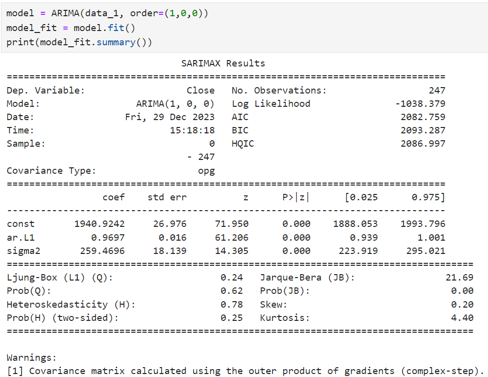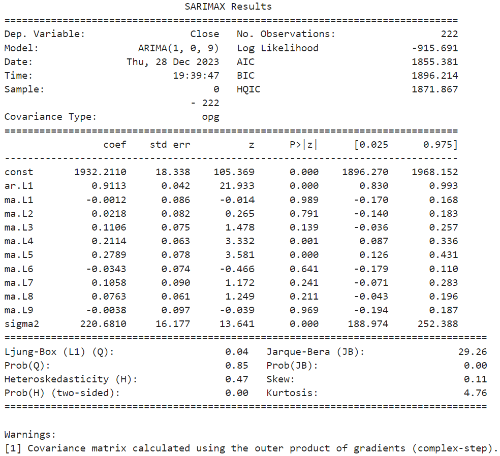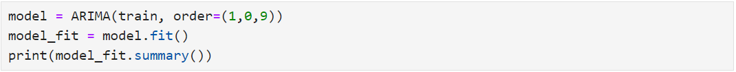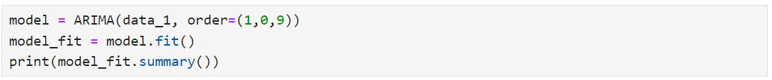 Since we will not be applying differencing (d=0), now we have to determine the other parameters (p,q) for the model we will be using from ARIMA (p,d,q). Given PACF plot having a significant spike at lag 1, while the ACF plot showed significant spikes up to lag 9, we will try p=1 and q=9. Next we will fit the ARIMA model using statsmodel package.