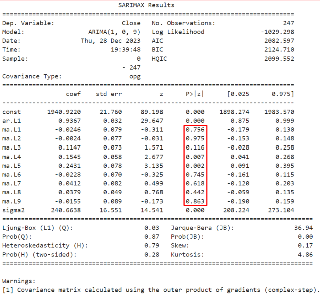 However from the previous model, most of the MA coefficients do not appear to be statistically significant (red highlight). Perhaps we can try excluding the MA and set different "q" paramaters for the model (p,d,q). In this case, we try setting "q" to 0.
