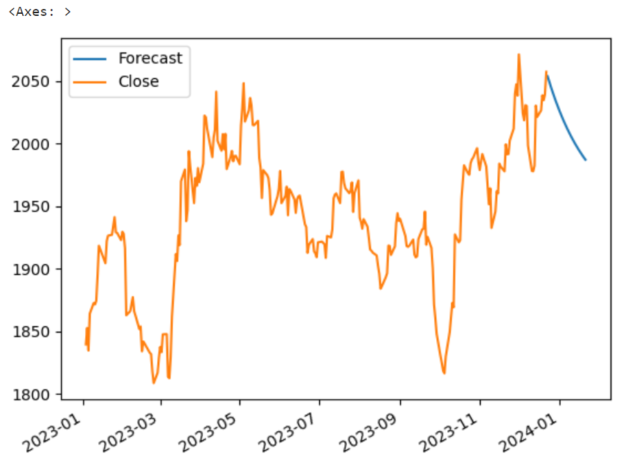 If we fit the entire dataset (train+test) to forecast the future prices, it appears that the gold price is also forecasted to retrace from its current values.