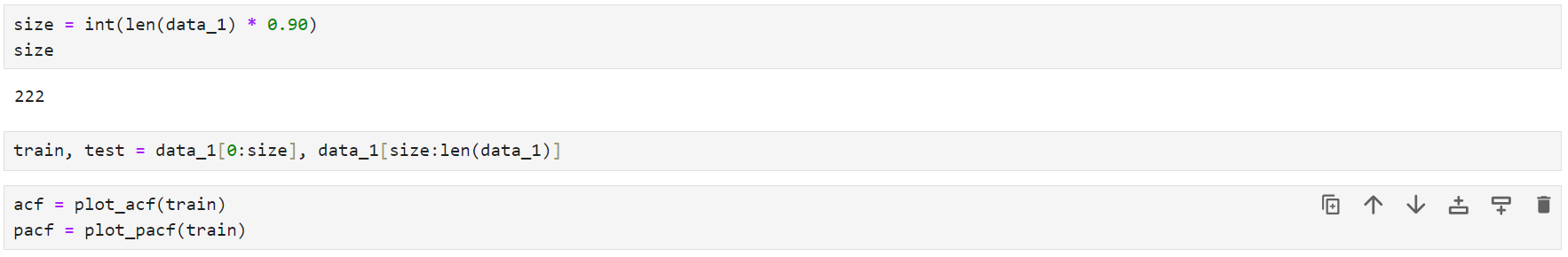 Next we will split the time series into training and test sets, 90% and remaining 10% respectively. After which we will look at the correlation of the time series with its lag through the ACF and PACF plots. Below, the PACF plot (right side) shows partial autocorrelation having a significant spike at lag 1 while in the ACF plot (left side), the correlations with the lags are positive and having a gradual decay.